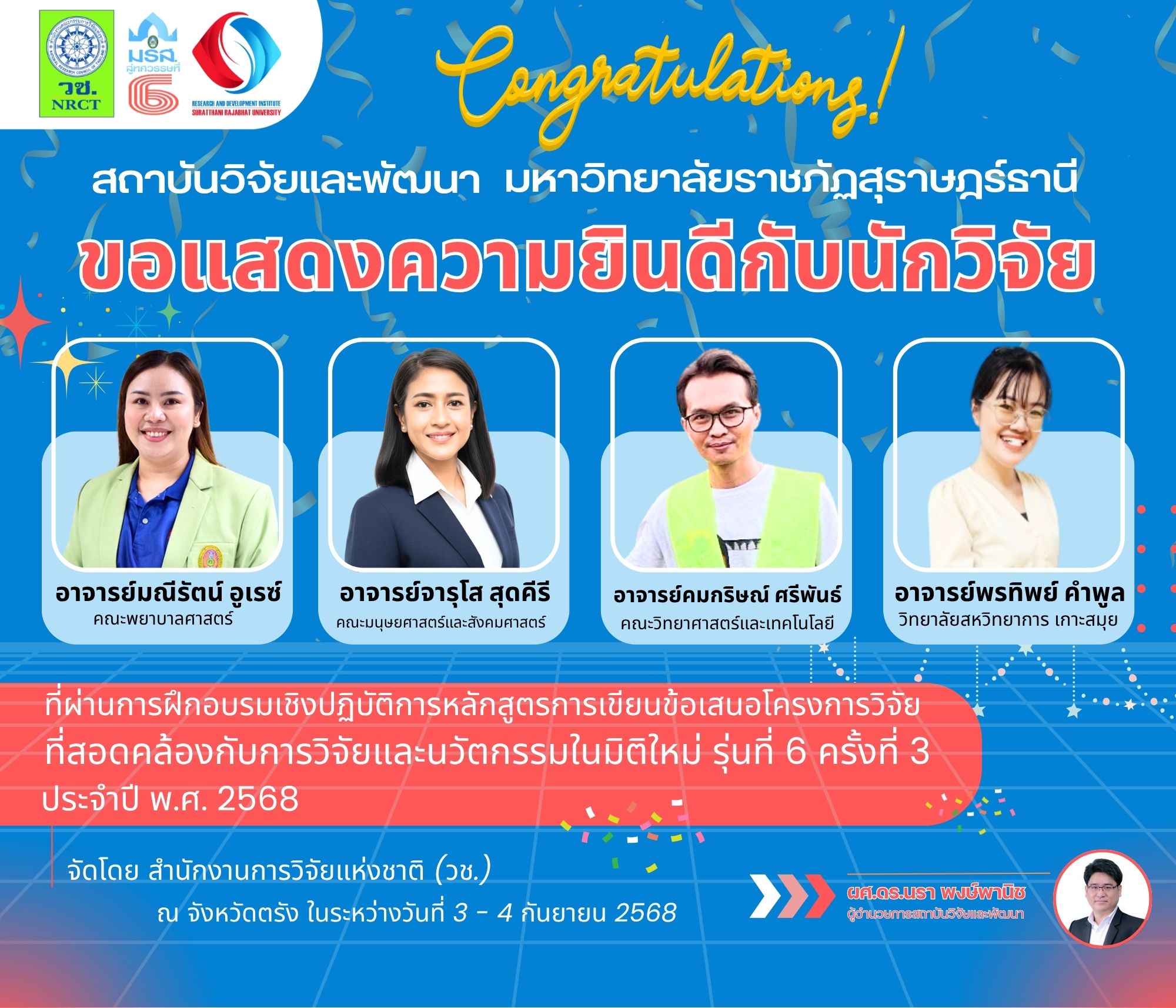 สถาบันวิจัยและพัฒนา ขอแสดงความยินดีกับนักวิจัยทั้ง 4 ท่าน ที่ผ่านการฝึกอบรมเชิงปฏิบัติการหลักสูตรการเขียนข้อเสนอโครงการวิจัยที่สอดคล้องกับการวิจัยและนวัตกรรมในมิติใหม่ รุ่นที่ 6 ครั้งที่ 3 ประจำปี พ.ศ. 2568 ตุลาคม 6, 2025 chutinan ข่าวประชาสัมพันธ์ ว13186_0001Download Share This Twitter Facebook LinkedIn Email chutinan Related Posts กปว. เปิดรับข้อเสนอโครงการเบื้องต้น ประจำปี 2569 กองส่งเสริมและป… สวพ.ขอแสดงความยินดีกับนักวิจัยที่ผลงานได้รับการตีพิมพ์ประจำเดือนสิงหาคม-กันยายน 2568 รายการตีพิมพ์บท… สวพ.เข้าร่วมอบรมเชิงปฏิบัติการจัดทำคำของบประมาณ FF ประจำปีงบประมาณ 2570 วันที่ 1 ตุลาคม…