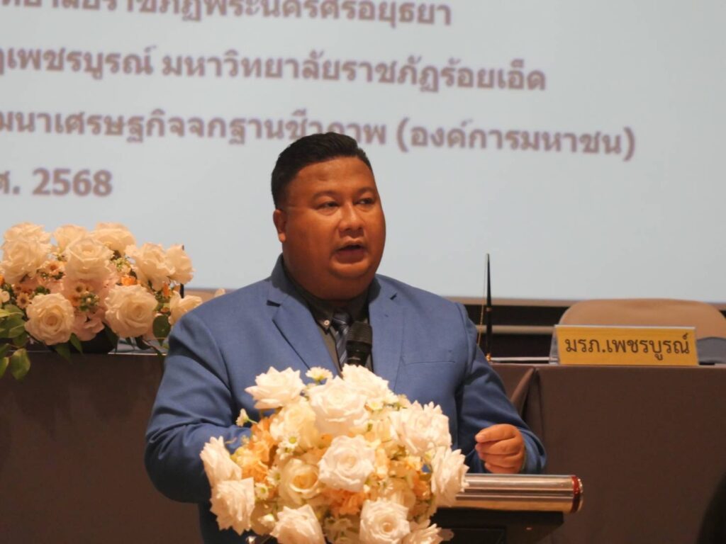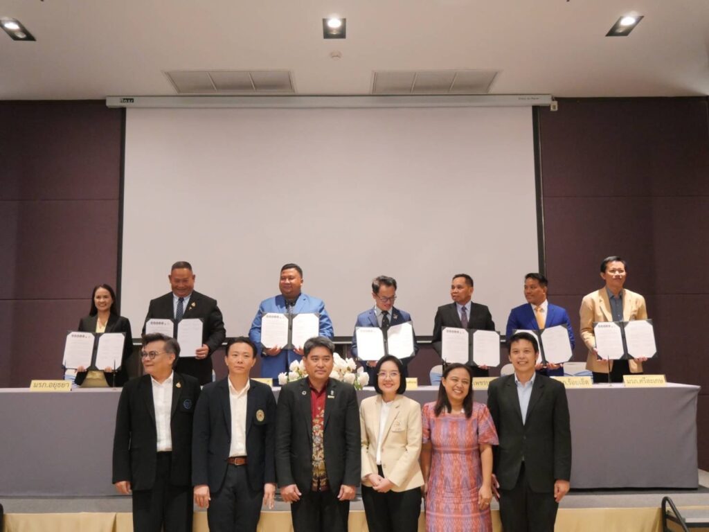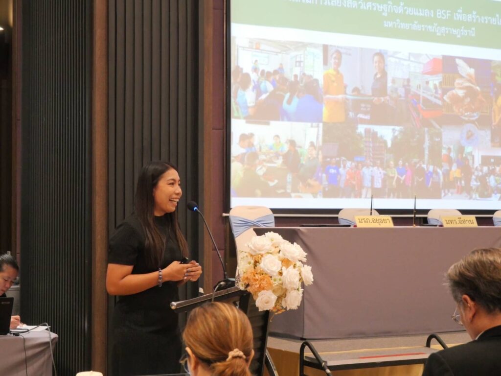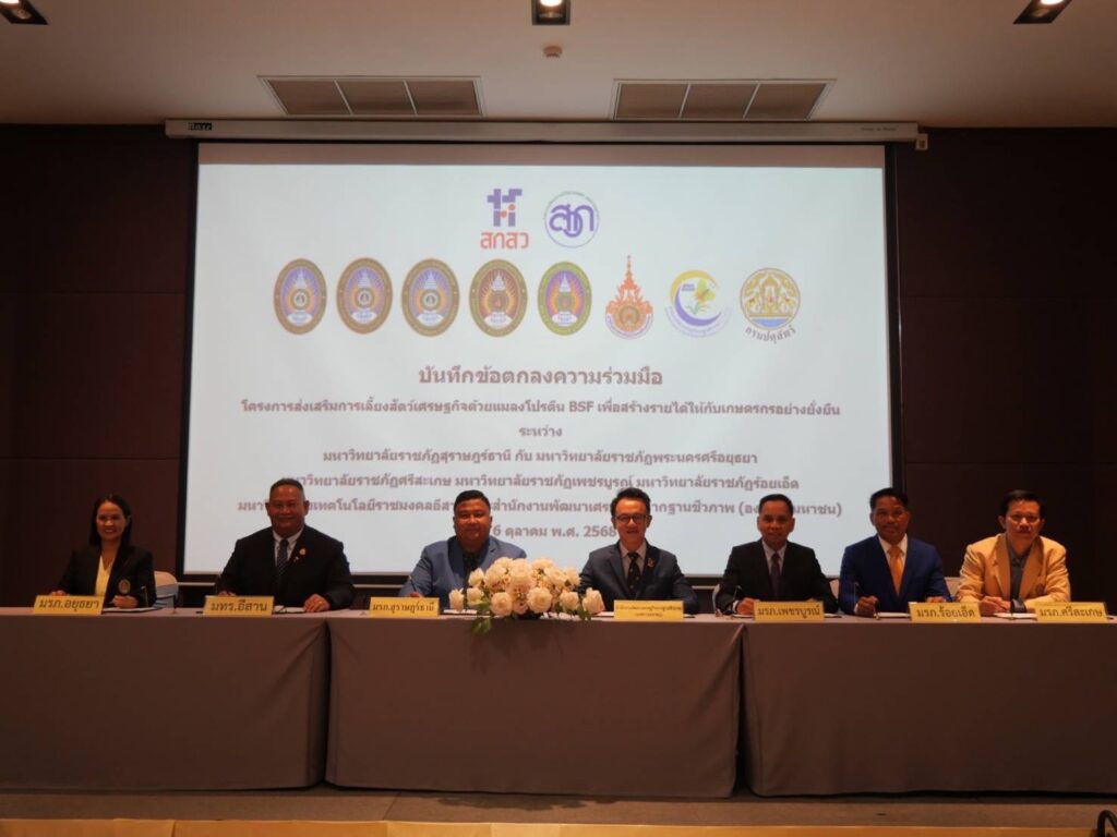 วันที่ 6 ตุลาคม 2568 ผู้ช่วยศาสตราจารย์ ดร.วัฒนา รัตนพรหม อธิการบดีมหาวิทยาลัยราชภัฏสุราษฎร์ธานี มอบหมายให้ ดร.สมปราชญ์ วุฒิจันทร์ รองอธิการบดีฝ่ายพัฒนางานวิจัยและนวัตกรรม พร้อมด้วย ผู้ช่วยศาสตราจารย์ ดร.นรา พงษ์พานิช ผู้อำนวยการสถาบันวิจัยและพัฒนา และทีมนักวิจัย ประกอบด้วย ผู้ช่วยศาสตราจารย์ ดร.เบญจวรรณ คงขน อาจารย์ประจำคณะวิทยาการจัดการ และอาจารย์นัสวัล บุญวงศ์ อาจารย์ประจำคณะวิทยาศาสตร์และเทคโนโลยี เข้าร่วมพิธีลงนามบันทึกข้อตกลงความร่วมมือ (MOU) การดำเนินโครงการส่งเสริมการเลี้ยงสัตว์เศรษฐกิจด้วยแมลงโปรตีน BSF เพื่อสร้างรายได้ให้กับเกษตรกรอย่างยั่งยืน ระหว่าง มหาวิทยาลัยราชภัฏสุราษฎร์ธานี กับ มหาวิทยาลัยราชภัฏพระนครศรีอยุธยา มหาวิทยาลัยราชภัฏศรีสะเกษ มหาวิทยาลัยราชภัฏเพชรบูรณ์ มหาวิทยาลัยราชภัฏร้อยเอ็ด มหาวิทยาลัยเทคโนโลยีราชมงคลอีสาน และสำนักงานพัฒนาเศรษฐกิจจากฐานชีวภาพ (องค์การมหาชน) ณ โรงแรม ทีเค.พาเลซ แอนด์ คอนเวนชั่น แจ้งวัฒนะ กรุงเทพมหานคร