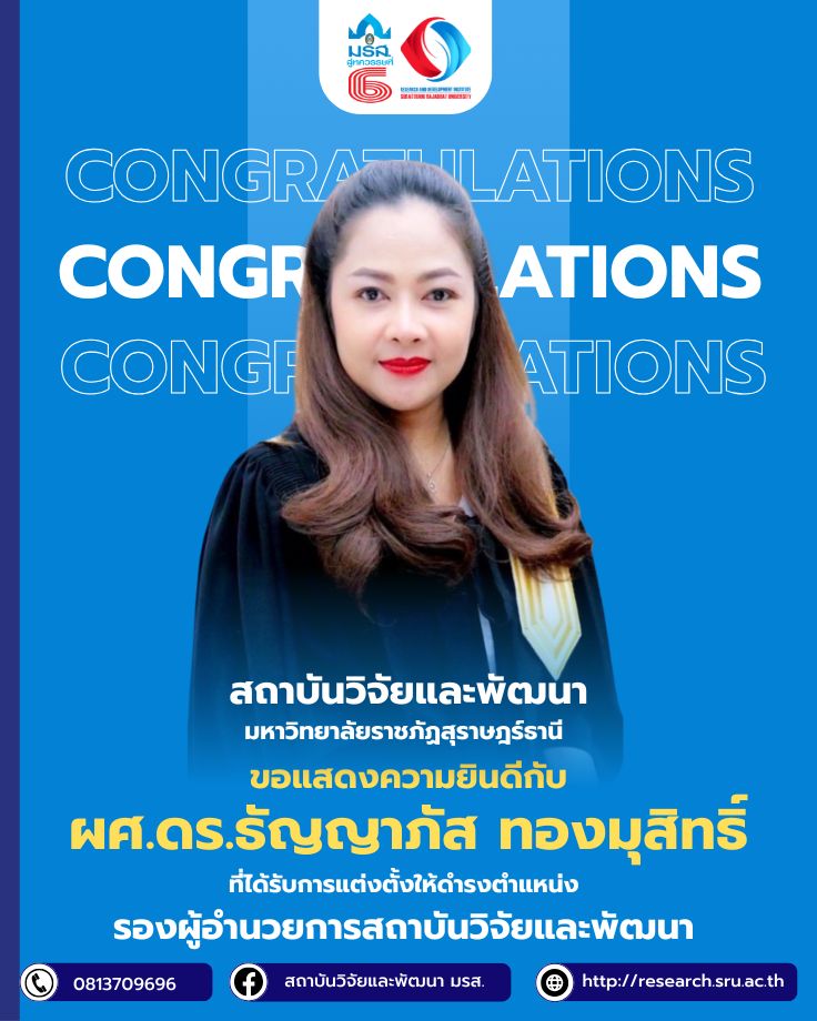 สถาบันวิจัยและพัฒนาขอแสดงความยินดีกับ ผศ.ดร.ธัญญาภัส ทองมุสิทธิ์ ที่ได้รับการแต่งตั้งให้ดำรงตำแหน่ง รองผู้อำนวยการสถาบันวิจัยและพัฒนา มหาวิทยาลัยราชภัฏสุราษฎร์ธานี ตุลาคม 7, 2025 chutinan ข่าวประชาสัมพันธ์ คำสั่งที่ 3480-68 แต่งตั้งรองผู้อำนวยการสถาบัDownload Share This Twitter Facebook LinkedIn Email chutinan Related Posts สวพ.นำนวัตกรรม “หมอนมนต์มงคลคว่ำหน้า” ร่วมจัดแสดงในงานสัมมนา Unlocking Trade Measures เสริมศักยภาพผู้ประกอบการสู่เวทีโลก วันที่ 8 ตุลาคม… สวพ.ประชุม RDI Meeting ครั้งที่ 7 เดินหน้ายกระดับงานวิจัยและนวัตกรรม พร้อมต้อนรับรองผู้อำนวยการคนใหม่ วันที่ 8 ตุลาคม… สวพ.ยกระดับงานวิจัยด้วยกระบวนการวิศวกรสังคมและปฐมนิเทศนักวิจัยโครงการพัฒนาท้องถิ่น วันที่ 8 ตุลาคม…