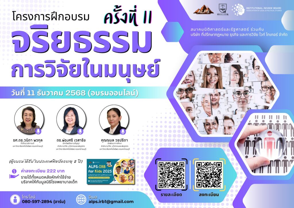 ขอเชิญชวน คณาจารย์ นักวิจัย นักวิชาการ นิสิต/นักศึกษา เข้าร่วมโครงการอบรม จริยธรรมการวิจัยในมนุษย์ ครั้งที่ 11 ประจำปี 2568