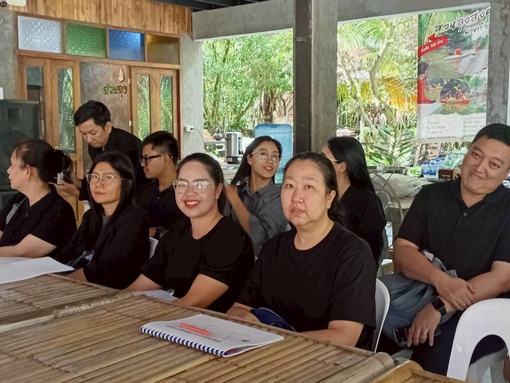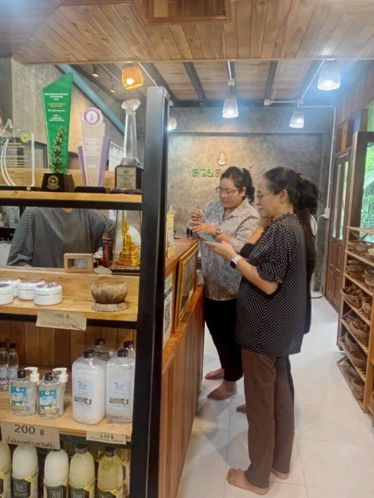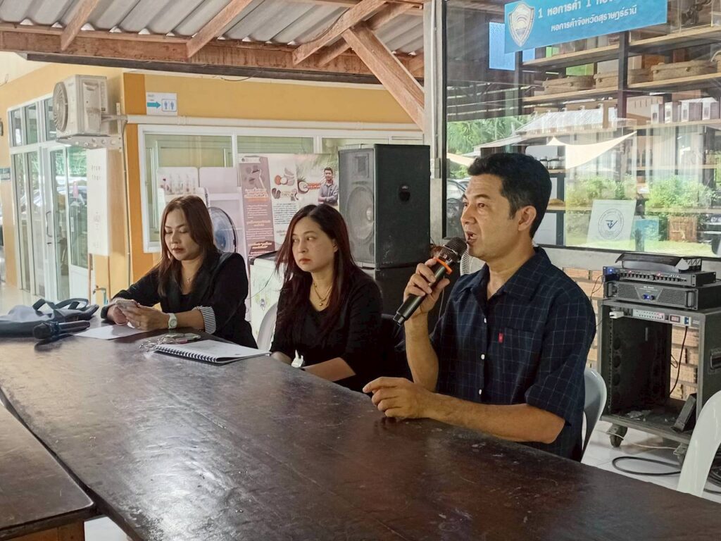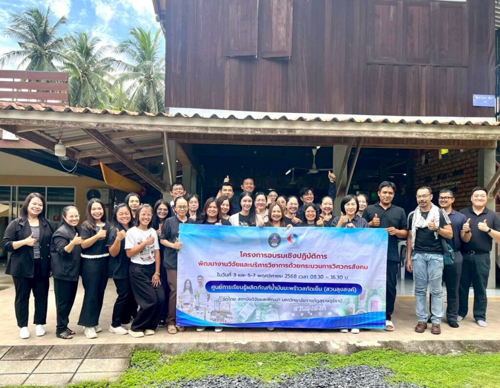 วันที่ 3 พฤศจิกายน 2568 ผู้ช่วยศาสตราจารย์ ดร.นรา พงษ์พานิช ผู้อำนวยการสถาบันวิจัยและพัฒนา มหาวิทยาลัยราชภัฏสุราษฎร์ธานี จัดอบรม เชิงปฏิบัติการ “พัฒนางานวิจัยและบริการวิชาการด้วยกระบวนการวิศวกรสังคม” เพื่อเสริมสร้างศักยภาพคณาจารย์ให้เข้าใจบริบทของพื้นที่และพัฒนางาน วิจัยที่ตอบสนองต่อความต้องการของชุมชนอย่างแท้จริง โดยมี ผู้ช่วยศาสตราจารย์ ดร.ธัญญาภัส ทองมุสิทธิ์ รองผู้อำนวยการสถาบันวิจัยและพัฒนา ผู้ช่วยศาสตราจารย์จีรนันท์ กล่อมนรา แก้วรักษา เป็นวิทยากร และผู้ช่วยศาสตราจารย์ ดร.ฉัตตมาศ วิเศษสินธุ์ ร่วมดำเนินกิจกรรม ทั้งนี้ หนึ่งในพื้นที่ปฏิบัติการ คือ “ศูนย์การเรียนรู้น้ำมันมะพร้าวสกัดเย็น (สวนลุงสงค์)” ซึ่งเป็นแหล่งเรียนรู้ด้านการผลิตน้ำมันมะพร้าวที่ได้รับการรับรองมาตรฐานเกษตรอินทรีย์ (Organic Thailand) จากกรมวิชาการเกษตร และมีผลิตภัณฑ์แปรรูปที่ได้รับการรับรองมาตรฐานต่าง ๆ เช่น GAP, ฮาลาล, OTOP 5 ดาว และคาร์บอนฟุตปริ้นต์ (Carbon Footprint) โดยผลิตภัณฑ์น้ำมันมะพร้าวดังกล่าวได้นำมาต่อยอดด้วยนวัตกรรมเป็นเครื่องสำอางภายใต้แบรนด์ “Prow Thai by สวนลุงสงค์” ซึ่งสืบสานภูมิปัญญาท้องถิ่นที่ใช้น้ำมันมะพร้าวดูแลสุขภาพและความงามจากอดีตถึงปัจจุบัน พร้อมทั้งร่วมแลกเปลี่ยนเรียนรู้กับชุมชนเกี่ยวกับแนวทางพัฒนาผลิตภัณฑ์ให้โดดเด่น ตอบโจทย์ผู้บริโภคยุคใหม่ การขยายช่องทางตลาด และการจัดทำมะพร้าว GI (Geographical Indication) เพื่อยกระดับอัตลักษณ์และมูลค่าของผลิตภัณฑ์ในพื้นที่