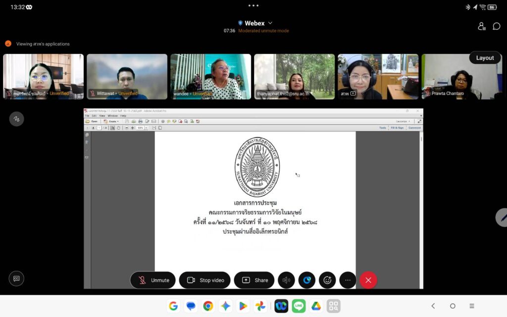 วันจันทร์ ที่ 10 พฤศจิกายน 2568 เวลา 13.30 น. รองศาสตราจารย์ ดร.วันดี สุทธรังษี ประธานคณะกรรมการจริยธรรมการวิจัยในมนุษย์ มหาวิทยาลัยราชภัฏสุราษฎร์ธานี ทำหน้าที่เป็นประธานกรรมการฯ ประชุมครั้งที่ 11/2568 ในรูปแบบออนไลน์ผ่านสื่ออิเล็กทรอนิกส์ (Cisco Webex Meeting) โดยมี รองศาสตราจารย์ ดร.ชูชาติ พันธ์สวัสดิ์ รองประธานคณะกรรมการฯ ผู้ช่วยศาสตราจารย์ ดร.นรา พงษ์พานิช ผู้อำนวยการสถาบันวิจัยและพัฒนา เป็นกรรมการและเลขานุการ ผู้ช่วยศาสตราจารย์ ดร.ธัญญาภัส ทองมุสิทธิ์ รองผู้อำนวยการสถาบันวิจัยและพัฒนา และนางสาวจุรีภรณ์ เนียมสมบัติ หัวหน้าสำนักงานผู้อำนวยการสถาบันวิจัยและพัฒนา เป็นผู้ช่วยเลขานุการ รายงานผลการพิจารณารับรองจริยธรรมการวิจัยในมนุษย์ เดือนพฤศจิกายน พ.ศ. 2568 จำนวน 19 โครงการ โดยมีรายละเอียด ดังนี้