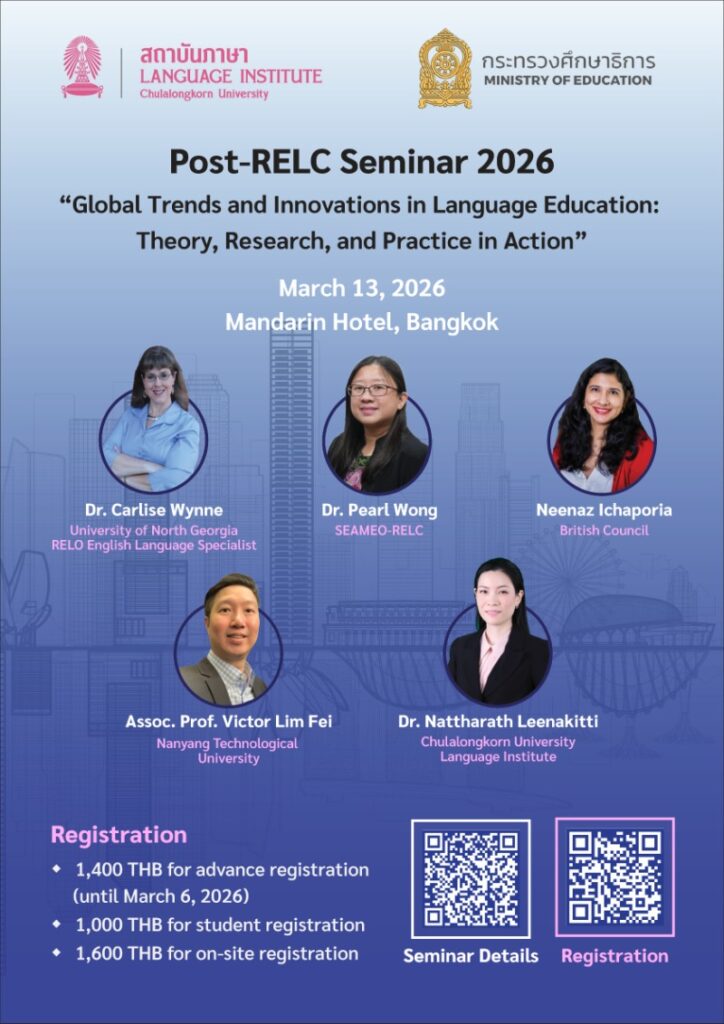 สถาบันภาษา จุฬาลงกรณ์มหาวิทยาลัย ร่วมกับกระทรวงศึกษาธิการ และคณะอนุกรรมการประสานงานระดับชาติเกี่ยวกับศูนย์ภาษาของซีมีโอ เป็นเจ้าภาพในการจัด Post-RELC Seminar 2026