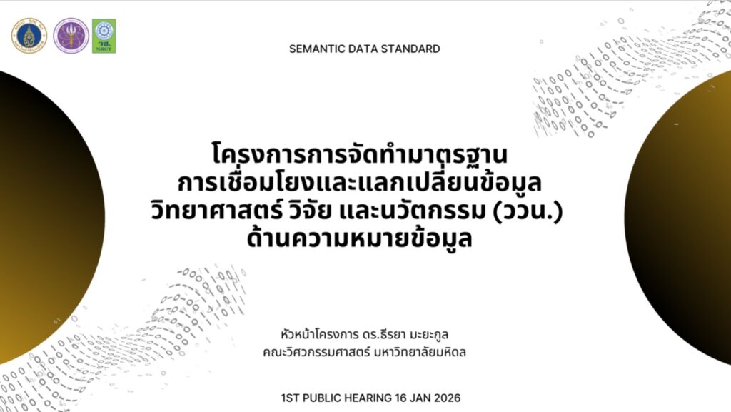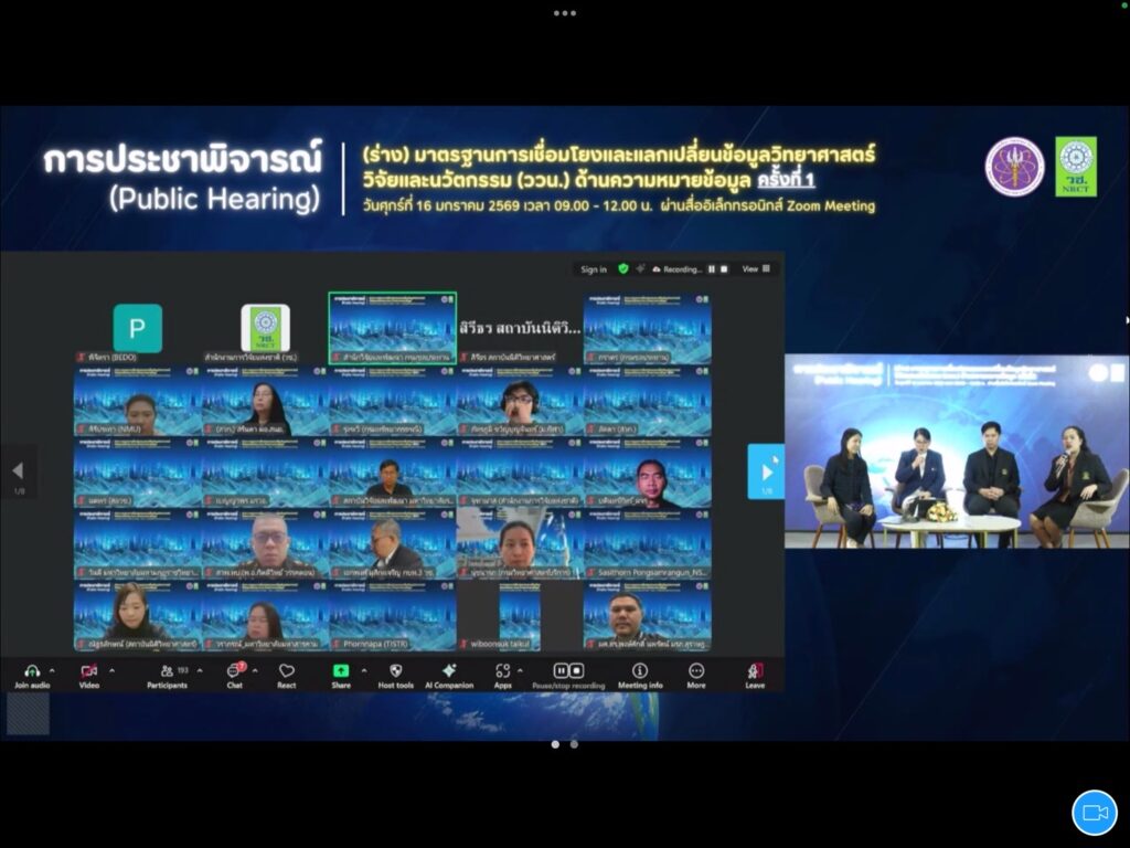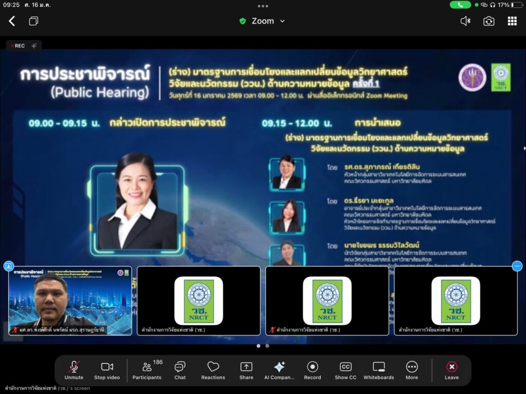 วันที่ 16 มกราคม 2569 ผู้ช่วยศาสตราจารย์ ดร.นรา พงษ์พานิช ผู้อำนวยการสถาบันวิจัยและพัฒนา มอบหมายให้ ผู้ช่วยศาสตราจารย์ ดร.พงษ์ศักดิ์ นพรัตน์ รองผู้อำนวยการสถาบันวิจัยและพัฒนา และนางสาวจุรีภรณ์ เนียมสมบัติ หัวหน้าสำนักงานผู้อำนวยการสถาบันวิจัยและพัฒนา เข้าร่วมกิจกรรมการประชาพิจารณ์ (Public Hearing) (ร่าง) มาตรฐานการเชื่อมโยงและแลกเปลี่ยนข้อมูลวิทยาศาสตร์ วิจัยและนวัตกรรม (ววน.) ด้านความหมายข้อมูล ครั้งที่ 1 ในวันศุกร์ที่ 16 มกราคม 2569 เวลา 09.00-12.00 น. ในรูปแบบการประชุมทางไกลผ่านจอภาพ (Video Conference) ผ่าน Zoom Cloud Meeting โดยสำนักงานการวิจัยแห่งชาติ (วช.) ได้จัดทำมาตรฐานข้อมูลและโมเดลการเชื่อมโยงข้อมูล ววน. ด้านความหมายข้อมูล โดยมีวัตถุประสงค์เพื่อกำหนดรูปแบบ โครงสร้าง และความหมาย ของข้อมูลให้เป็นไปในทิศทางเดียวกัน