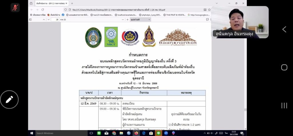 วันที่ 24 กุมภาพันธ์ 2569 เวลา 15.00 น. ผู้ช่วยศาสตราจารย์ ดร.นรา พงษ์พานิช ผู้อำนวยการสถาบันวิจัยและพัฒนา พร้อมด้วย ผู้ช่วยศาสตราจารย์ ดร.พงษ์ศักดิ์ นพรัตน์ รองผู้อำนวยการสถาบันวิจัยและพัฒนา เข้าร่วมประชุมคณะกรรมการดำเนินโครงการวิจัยเรื่อง “การบูรณาการนวัตกรรมข้ามศาสตร์เพื่อยกระดับผลิตภัณฑ์ผ้าท้องถิ่นด้วยเทคโนโลยีสู่การเสริมสร้างคุณภาพชีวิตและการท่องเที่ยวเชิงวัฒนธรรมในจังหวัดอุดรธานี” ครั้งที่ 1/2569 ในรูปแบบออนไลน์ผ่านระบบ Zoom โดยมี รองศาสตราจารย์ ดร.อนันตกุล อินทรผดุง หัวหน้าโครงการจากมหาวิทยาลัยราชภัฏพระนคร เป็นประธานการประชุม ร่วมกับ ทีมวิจัยจากมหาวิทยาลัยราชภัฏอุดรธานี มหาวิทยาลัยราชภัฏสุราษฎร์ธานี มหาวิทยาลัยราชภัฏบ้านสมเด็จเจ้าพระยา และมหาวิทยาลัยราชภัฏมหาสารคาม เข้าร่วมแลกเปลี่ยนข้อมูลและกำหนดทิศทางการดำเนินงานร่วมกันอย่างเข้มข้น